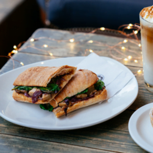 Hot drinks can be paired with a range of vegan-friendly milks, and even your favourite hot chocolate can be finished off with a creamy vegan topping. Sweet delights include a plant-based chocolate and caramelised biscuit cheesecake, and vegan granola flapjack – heavenly!