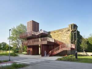 MEPC, the developer and asset manager behind the urban quarter, has created a lift and stairs along the existing wall of the viaduct to provide public access to the formerly disused rail track on top.