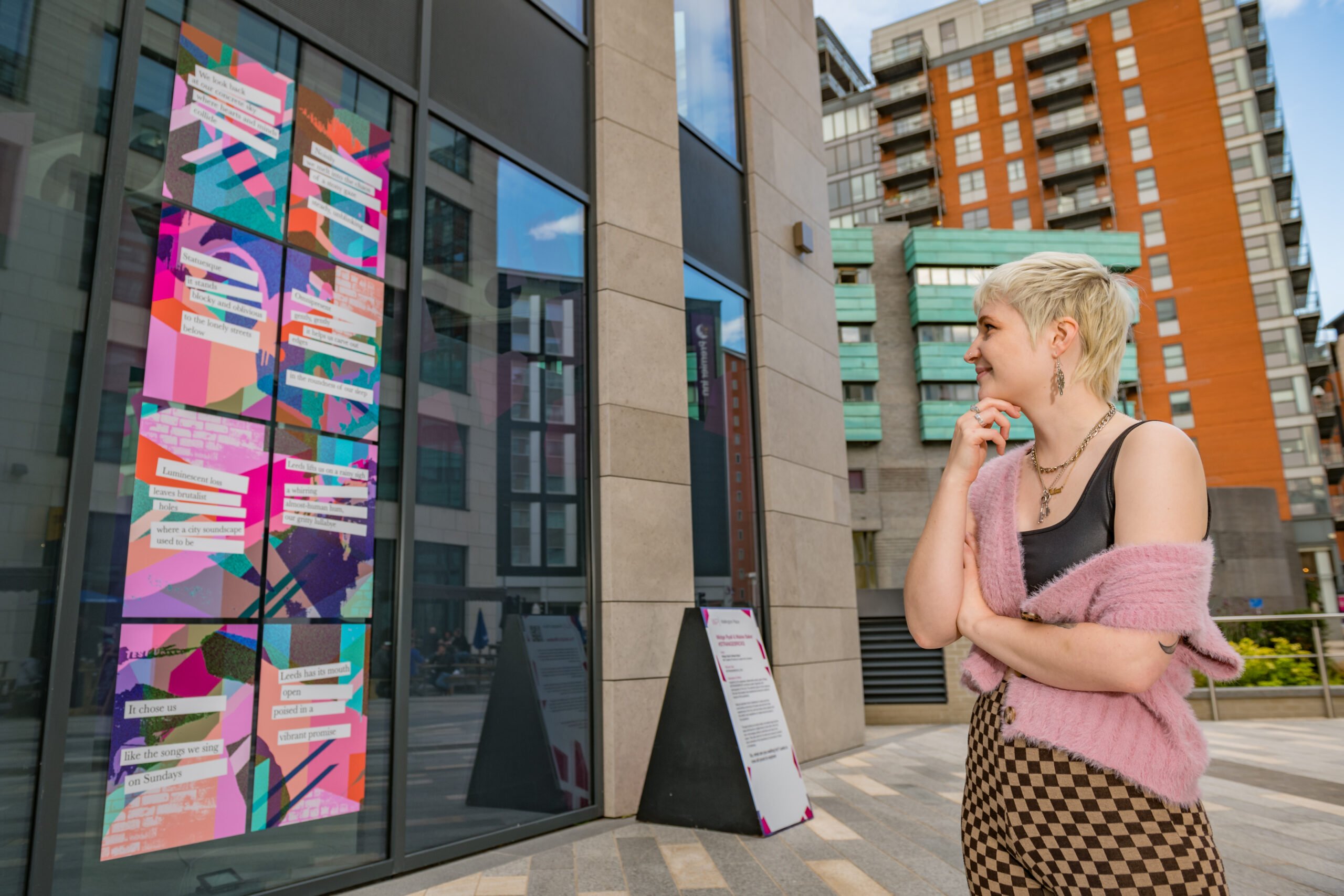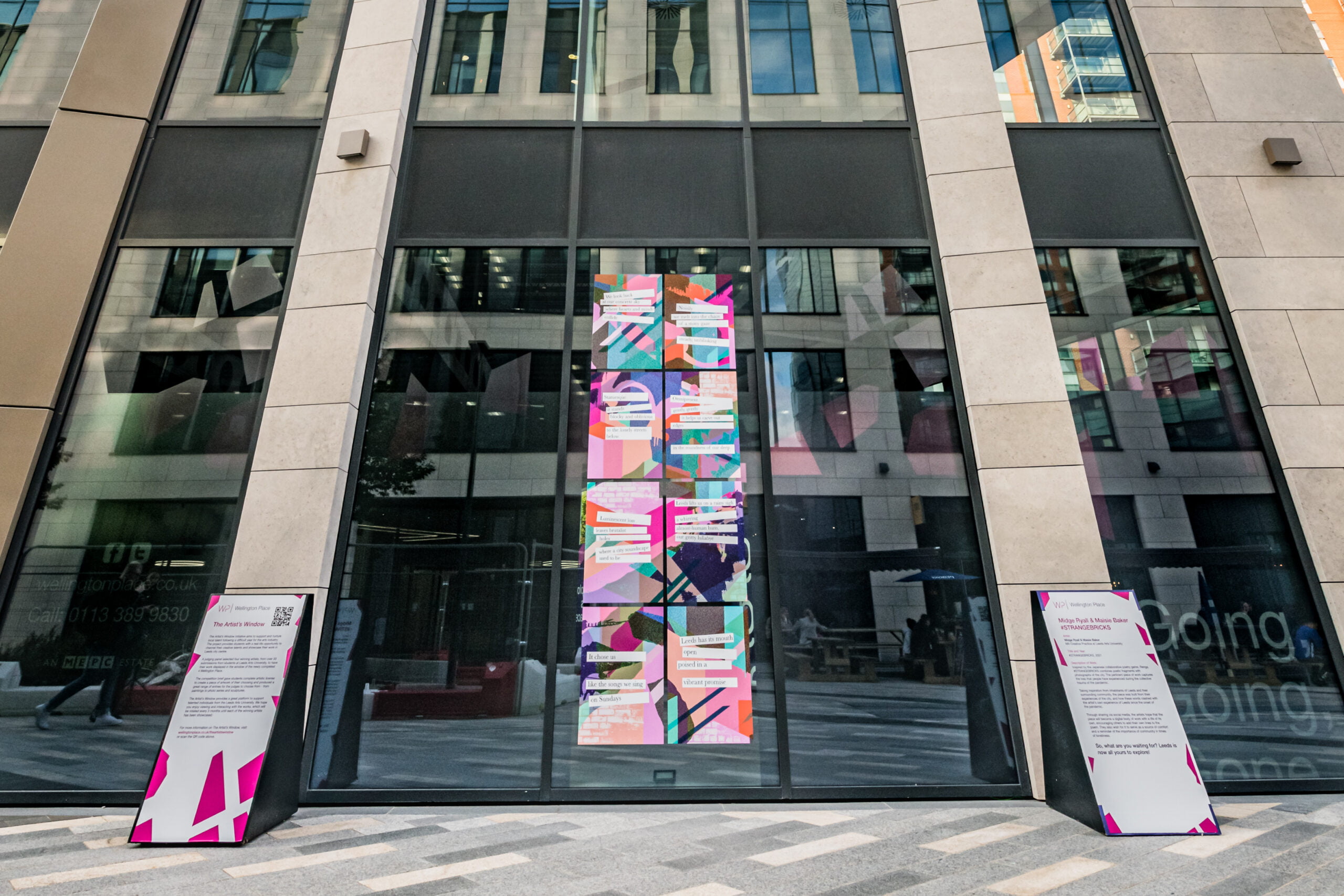 Speaking of the installation, Maisie and Midge, said: “We were both over the moon to have been chosen to display this work at Wellington Place. Through sharing via social media, we hope the piece will become a digital body of work with a life of its own, encouraging others to add their own lines to the poem. Our goal was to create something that could serve as a source of comfort for the inhabitants of Leeds, and a reminder of the importance of community in times of loneliness. We think it’s important for businesses to build community responsibility and providing a platform for local artists is a great way to do this.”