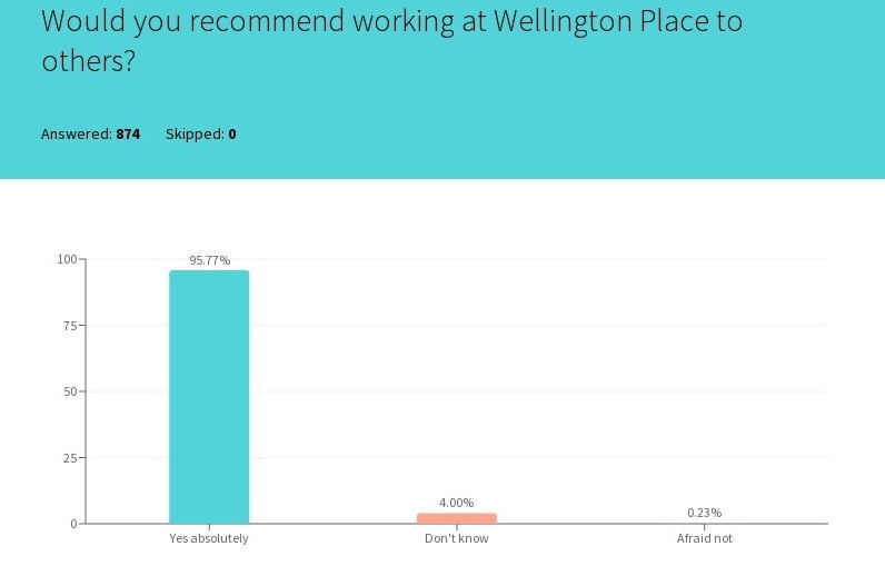 A whopping 95.77% of respondents said they would recommend working at Wellington Place to others.
