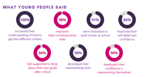 100% of students that took part in the programme last year said it increased their self-belief and their understanding of how to get into different careers as well as improving their speaking and listening skills, with 96% of students saying the programme made them think more about their own future goals.